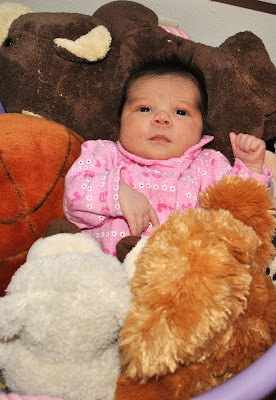 Jillian is now three weeks old and growing like a weed. When we brought her home she weighed 6 lbs. 9 oz. At her two week appointment she weighed 7 lbs. 10 oz. Her first couple of weeks we thought she might be a tiny bit colicky. No. No colic. Just my diet. She has been a new baby since I laid off the caffeinated sodas and anything remotely spicy. It's a bland diet, but it is really worth it. I had forgotten how many foods tear up a newborn tummy. So, no more red or green chile for a while. The happy baby I have in return is wonderful. Now she only really fusses when she is tired, hungry, or dirty. Much better than the cranky-anytime-she-was-awake fussing!